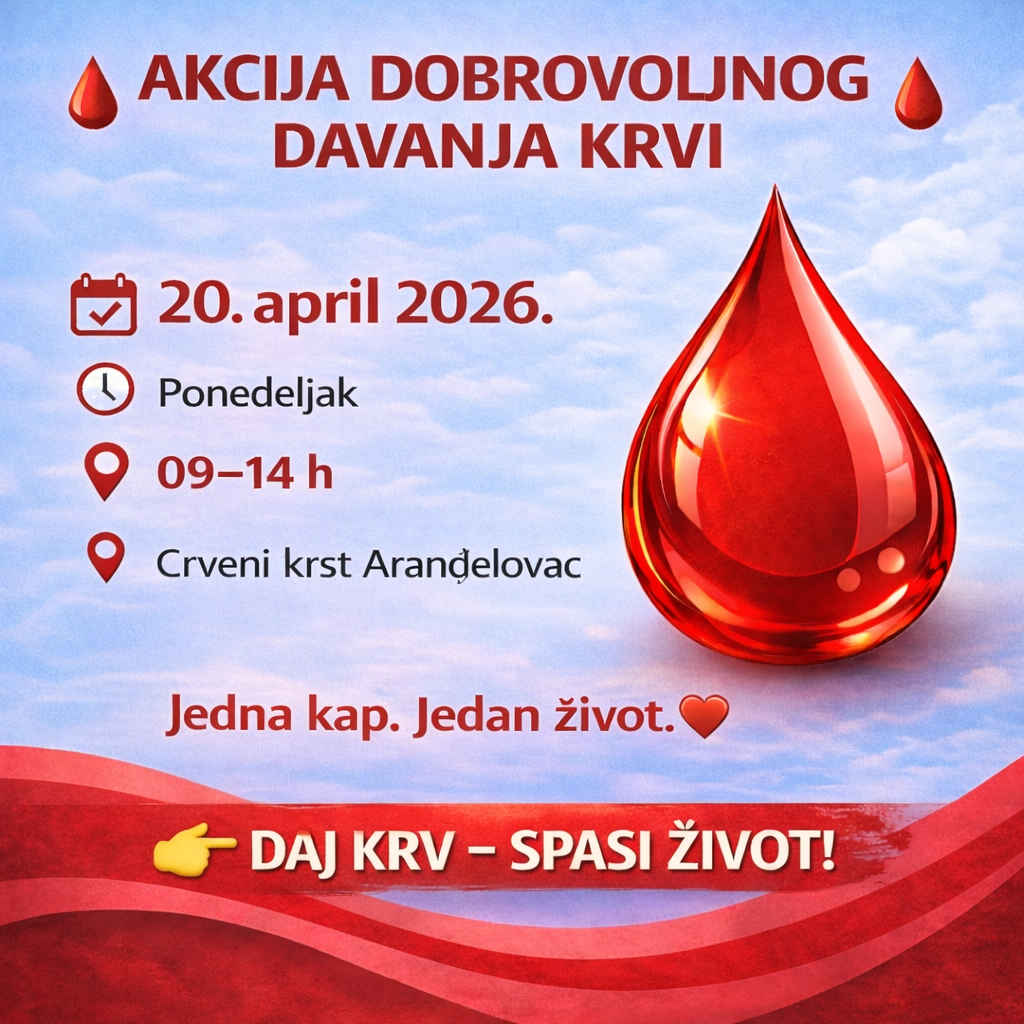 Crveni krst Arandjelovac u ponedeljak 20.04.2026. god. organizuje akciju dobrovoljnog davanja krvi u vremenu od 9 do 14 časova u prostorijama Crvenog krsta.